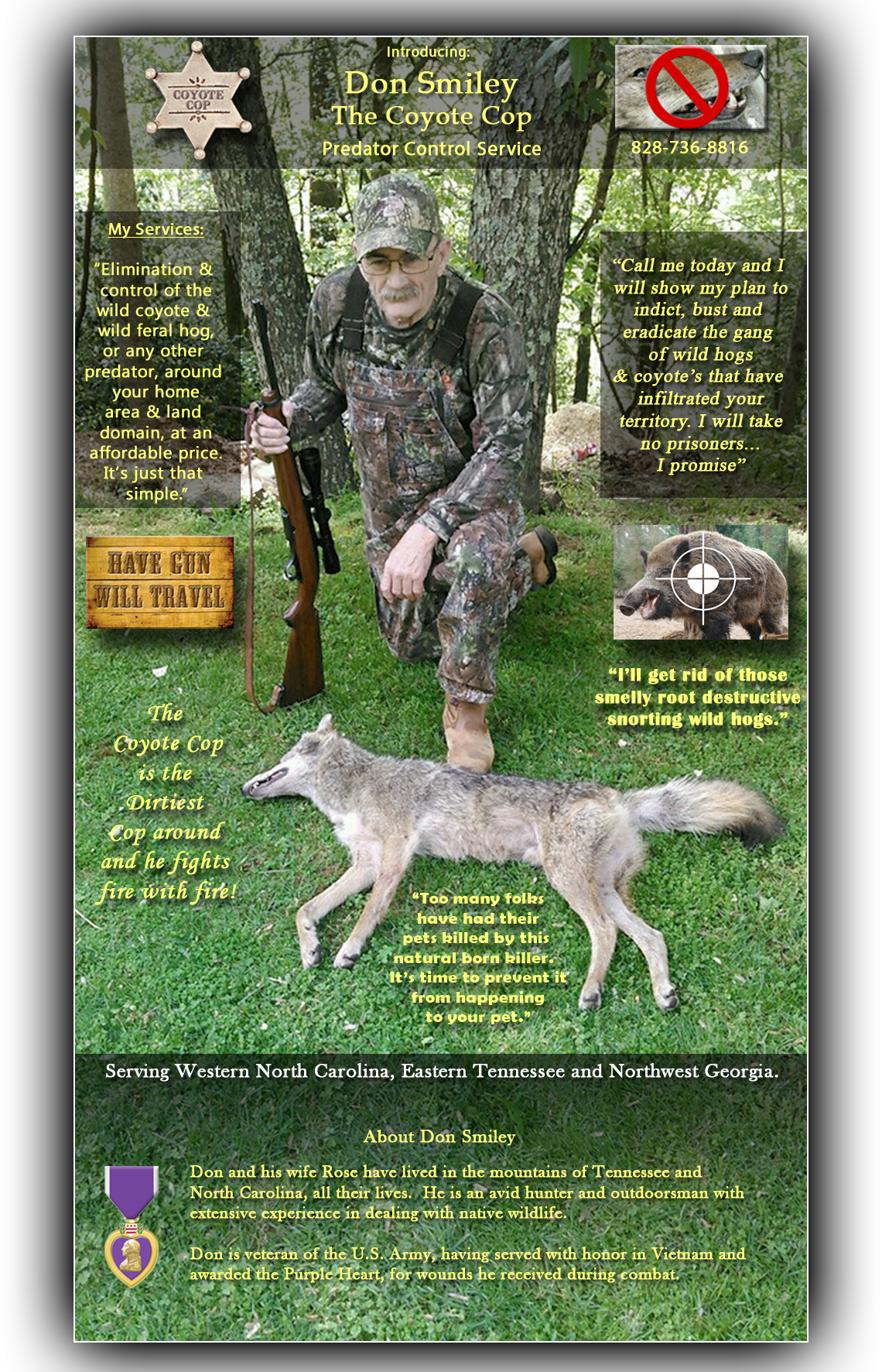Copyright 2017. All rights reserved. CoyoteCop Predator Control, 118 Ray Cline Drive, North Carolina 28789